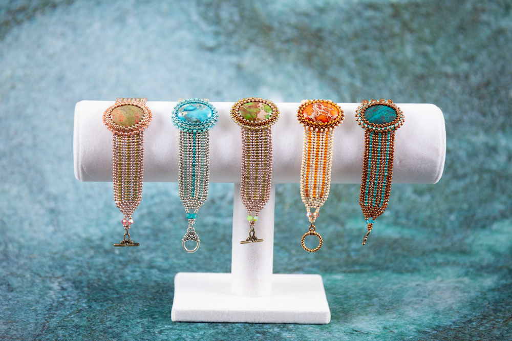 In meiner Arbeit verwende ich hochwertige Glasperlen der japanischen Firmen Miyuki und Toho, die Kristallsteine/Perlen von Swarovsky und Preciosa, sowie böhmische Facettenperlen und geschliffene oder facettierte Halbedelsteine.