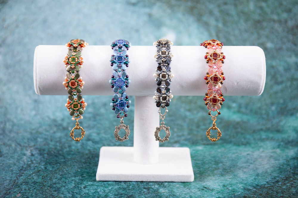 Japanische Saatperlen, Preciosa Beads und Kristallsteine, Swarovsky Kristallsteine, tschechische facettierte Glasperlen tschechische 2- und 3-Loch-Perlen.